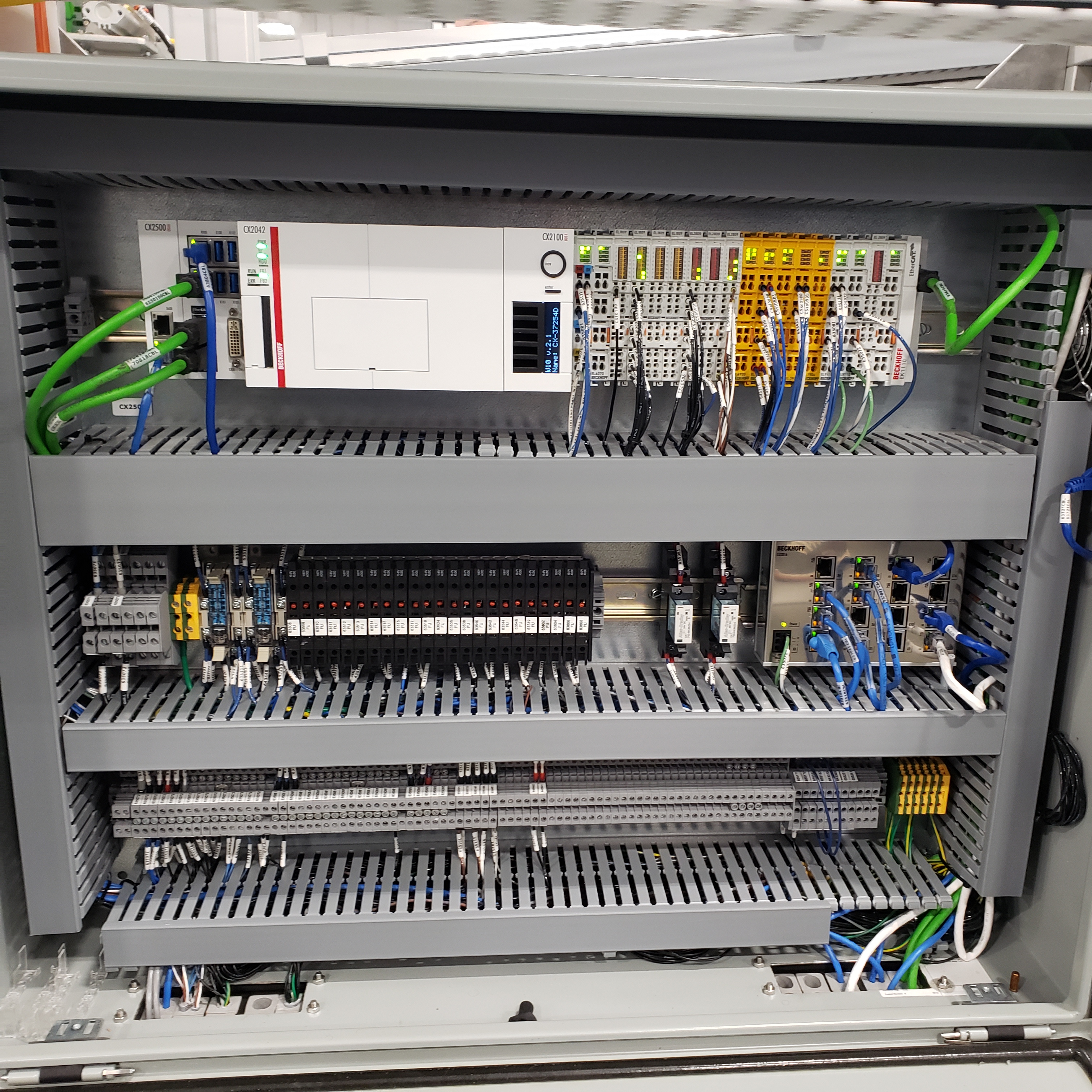 Manufacturing system controlled by 7 Windows servers and 5 Beckhoff PLCs integrated with Robotics and other control devices